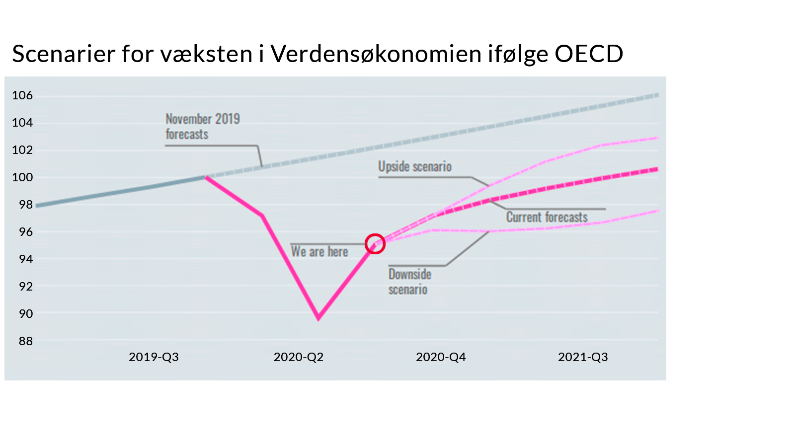 Figuren nedenfor viser OECD’s scenarier, der har et relativt stort udfaldsrum. Europa er sammen med Sydamerika og Indien de regioner, der er hårdest ramt af recessionen, mens Kina - jf. de officielle OECD-forventninger til væksten - er eneste land i verden med forventet positiv vækst i 2020. ECB og Nationalbanken har også for nylig opdateret deres bud på forventningerne og er på linje med OECD’s. Samstemmende fremhæves der i alle prognoserne, at scenarierne for væksten er behæftet med stor usikkerhed og er meget afhængig af, hvordan pandemien udvikler sig. Og ligeså med de politiske støtteordninger.